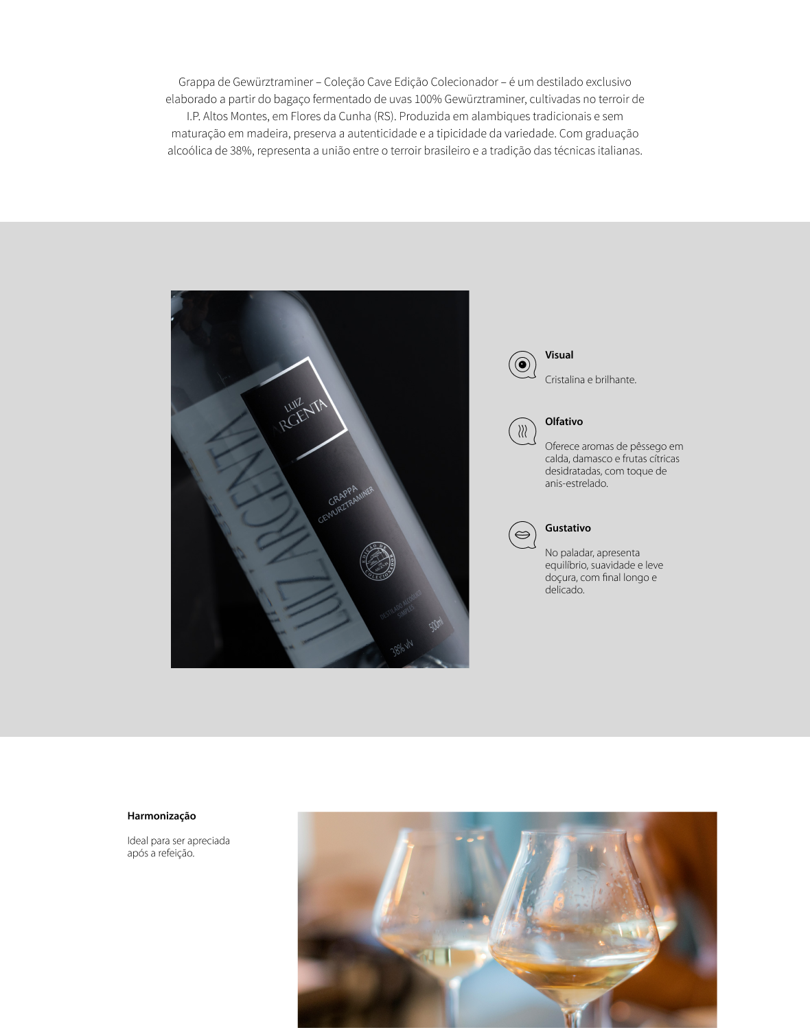 Grappa de Gewürztraminer – Coleção Cave Edição Colecionador – é um destilado exclusivo elaborado a partir do bagaço fermentado de uvas 100% Gewürztraminer, cultivadas no terroir de I.P. Altos Montes, em Flores da Cunha (RS). Produzida em alambiques tradicionais e sem maturação em madeira, preserva a autenticidade e a tipicidade da variedade. Com graduação alcoólica de 38%, representa a união entre o terroir brasileiro e a tradição das técnicas italianas.