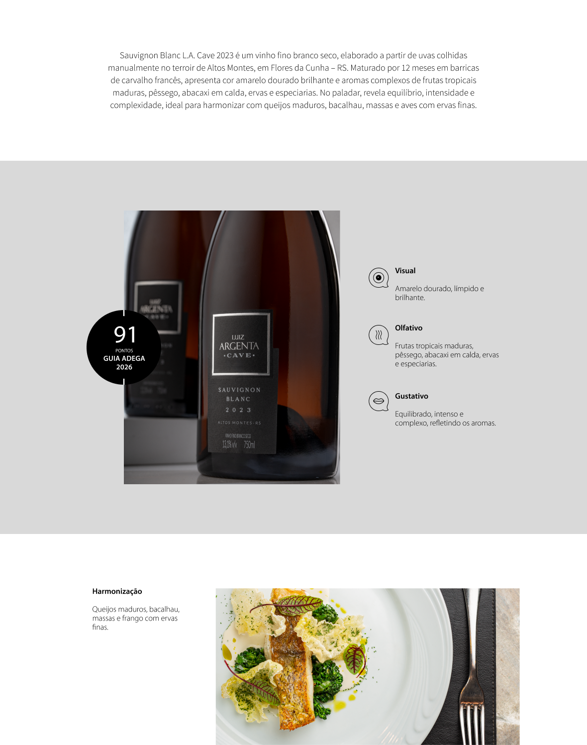 Sauvignon Blanc L.A. Cave 2023 é um vinho fino branco seco, elaborado a partir de uvas colhidas manualmente no terroir de Altos Montes, em Flores da Cunha – RS. Maturado por 24 meses em barricas de carvalho francês, apresenta cor amarelo-ouro brilhante e aromas complexos de frutas tropicais maduras, pêssego, abacaxi em calda, ervas e especiarias. No paladar, revela equilíbrio, intensidade e complexidade, ideal para harmonizar com queijos maduros, bacalhau, massas e aves com ervas finas.
