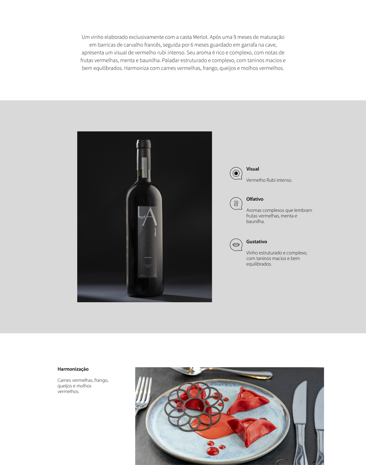 Um vinho elaborado exclusivamente com a casta Merlot. Após uma 9 meses de maturação em barricas de carvalho francês, seguida por 6 meses guardado em garrafa na cave, apresenta um visual de vermelho rubi intenso. Seu aroma é rico e complexo, com notas de frutas vermelhas, menta e baunilha. Paladar estruturado e complexo, com taninos macios e bem equilibrados. Harmoniza com carnes vermelhas, frango, queijos e molhos vermelhos.