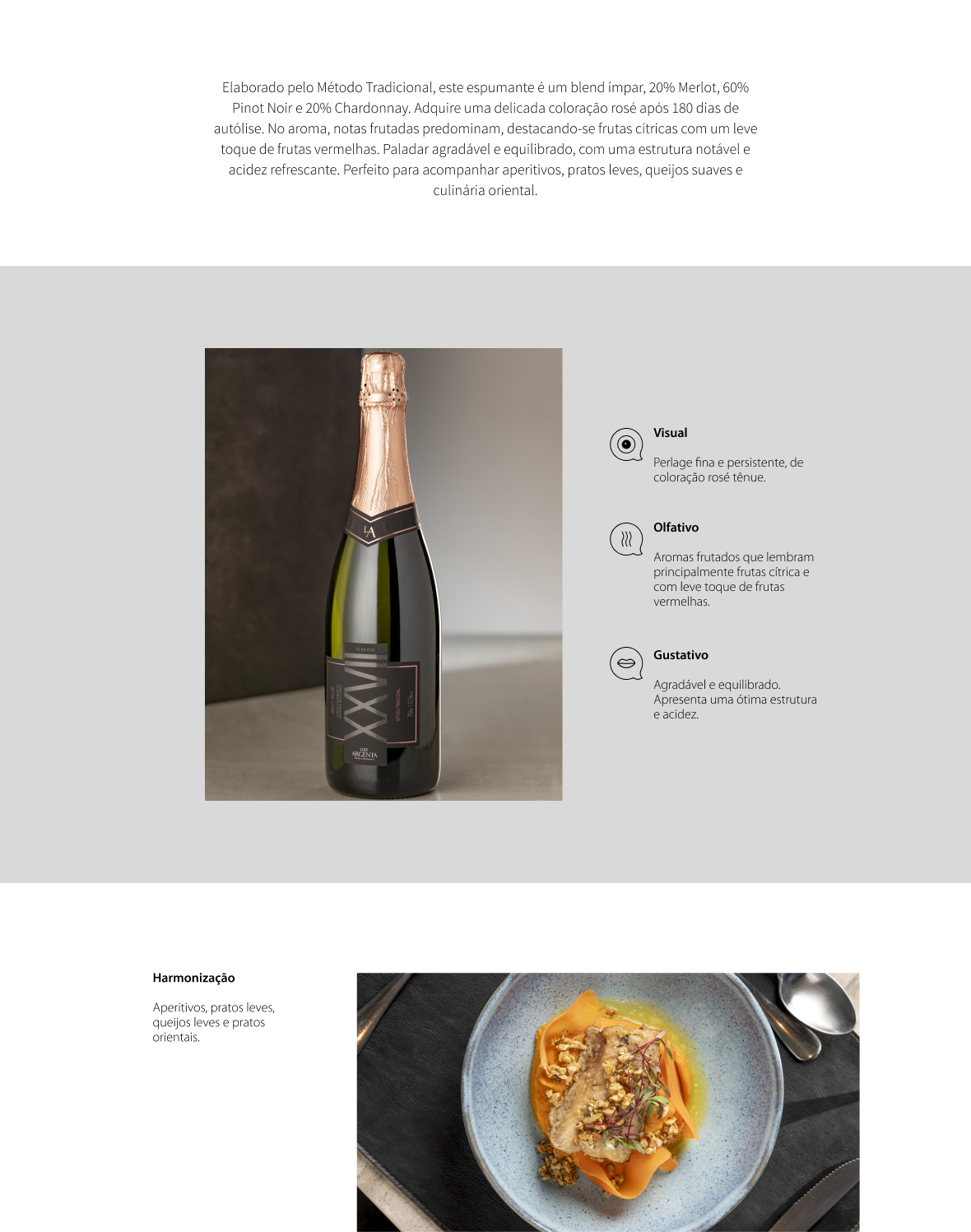 Elaborado pelo Método Tradicional, este espumante é um blend ímpar, 20% Merlot, 60% Pinot Noir e 20% Chardonnay. Adquire uma delicada coloração rosé após 180 dias de autólise. No aroma, notas frutadas predominam, destacando-se frutas cítricas com um leve toque de frutas vermelhas. Paladar agradável e equilibrado, com uma estrutura notável e acidez refrescante. Perfeito para acompanhar aperitivos, pratos leves, queijos suaves e culinária oriental.